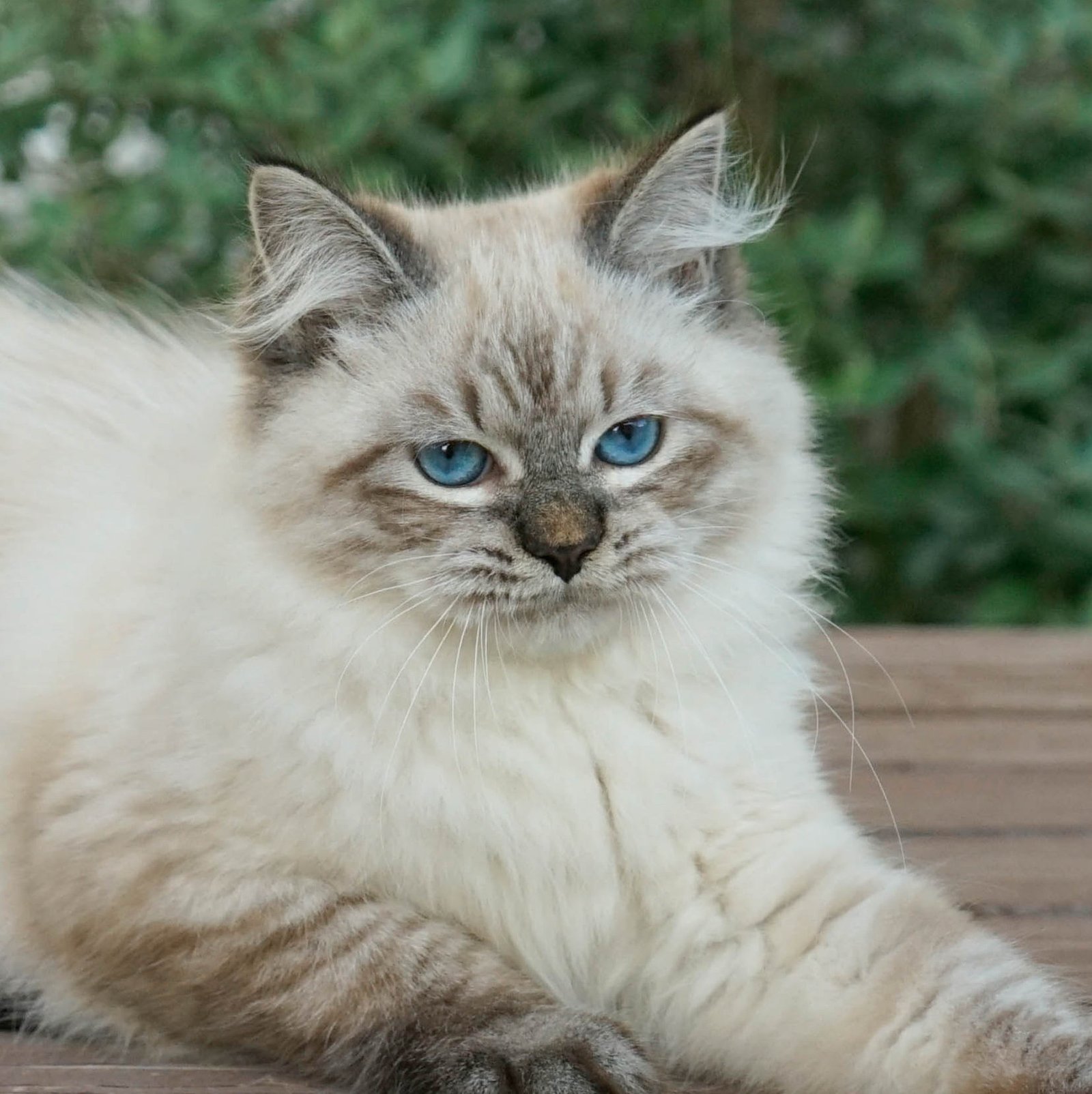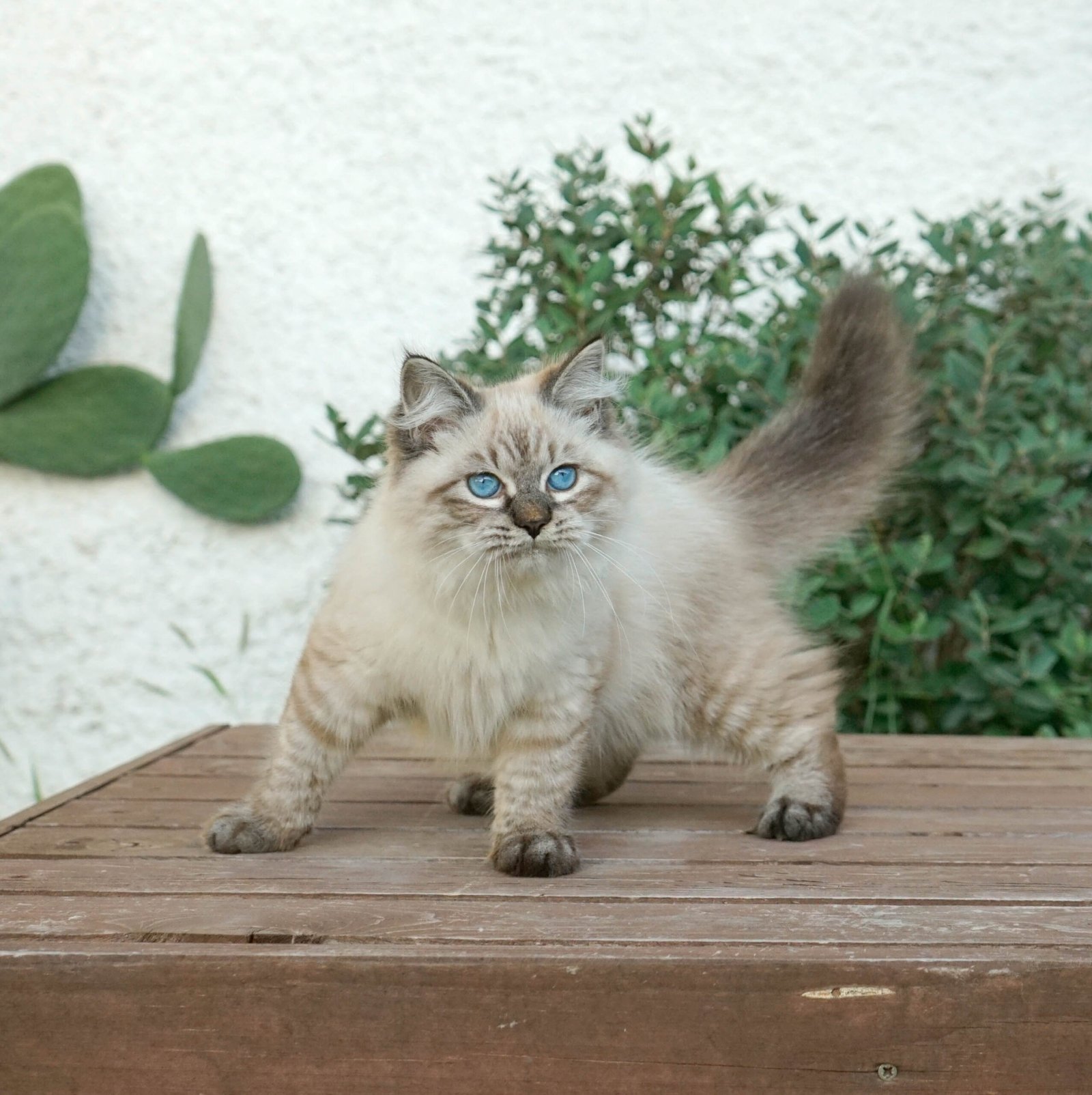 Sono una meraviglia della natura: il mio mantello seal tabby point è un capolavoro, e i miei occhi azzurri, di un blu profondo, brillano come gemme.