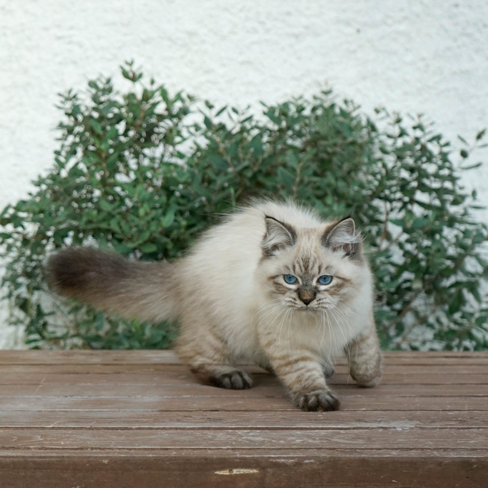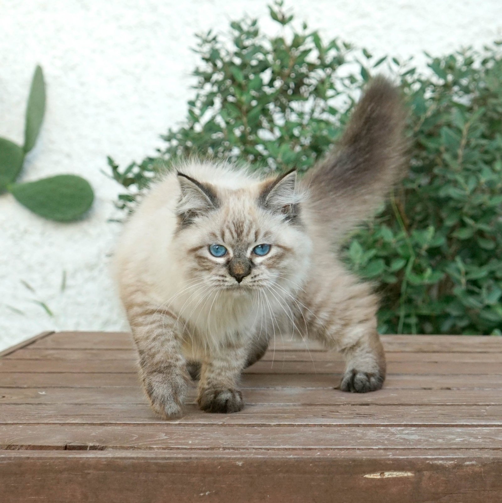 Mi presento: il mio nome è Nimah, un’eredità italiana con radici profonde che affondano nei prestigiosi allevamenti russi dei miei genitori. Sono ancora una piccola esploratrice, ma ho già conquistato il mio nuovo regno all’allevamento Acqua Marina. Qui, ho un solo obiettivo: scatenare il caos! Salto, rosicchio, mi intrufolo in ogni angolo proibito e pizzico con gioia i piedi dei miei adorati schiavi umani. Dicono che sia una vera peste, ma sotto questa vivacità si nasconde un cuore dolcissimo, pronto a dispensare fusa e coccole. E poi c’è Django, la mia dolce nemesi. Ci rincorriamo, ci tormentiamo, ma alla fine ci ritroviamo sempre per un momento di baci e abbracci. Se volete scoprire la mia personalità scatenata e il mio lato affettuoso, vi aspetto qui per riempirvi di coccole.